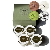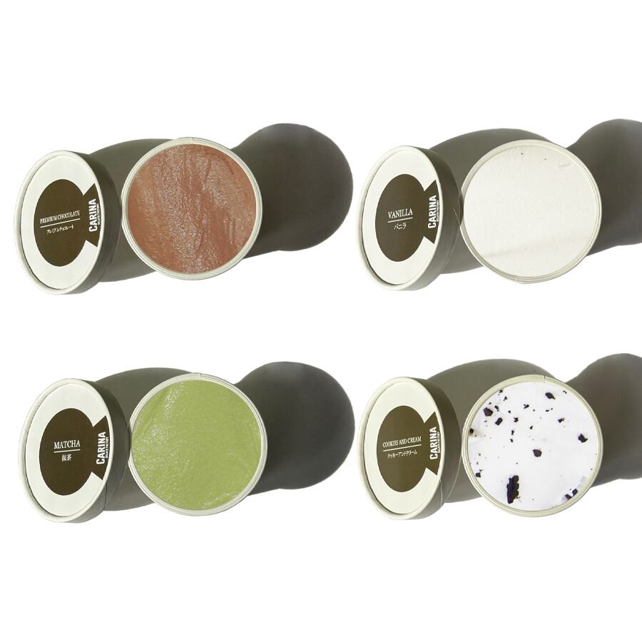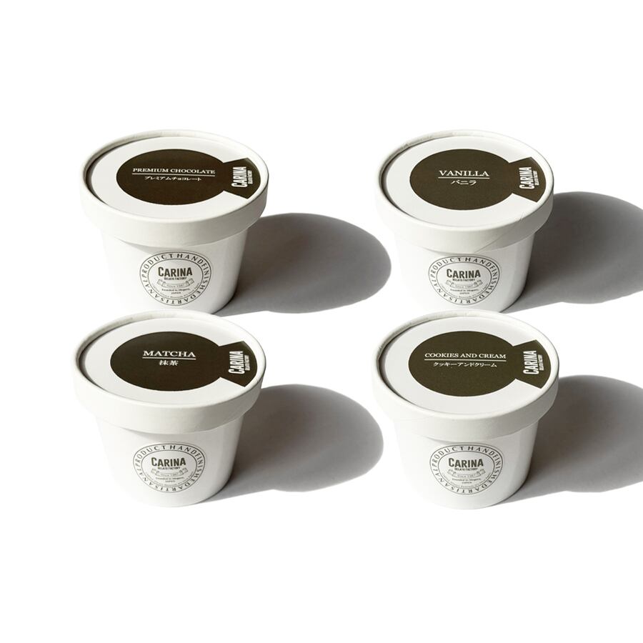 バニラジェラート、プレミアムチョコレートジェラート、抹茶ジェラート、クッキーアンドクリームジェラートをお好みの割合で4点選べるギフトボックスです。
